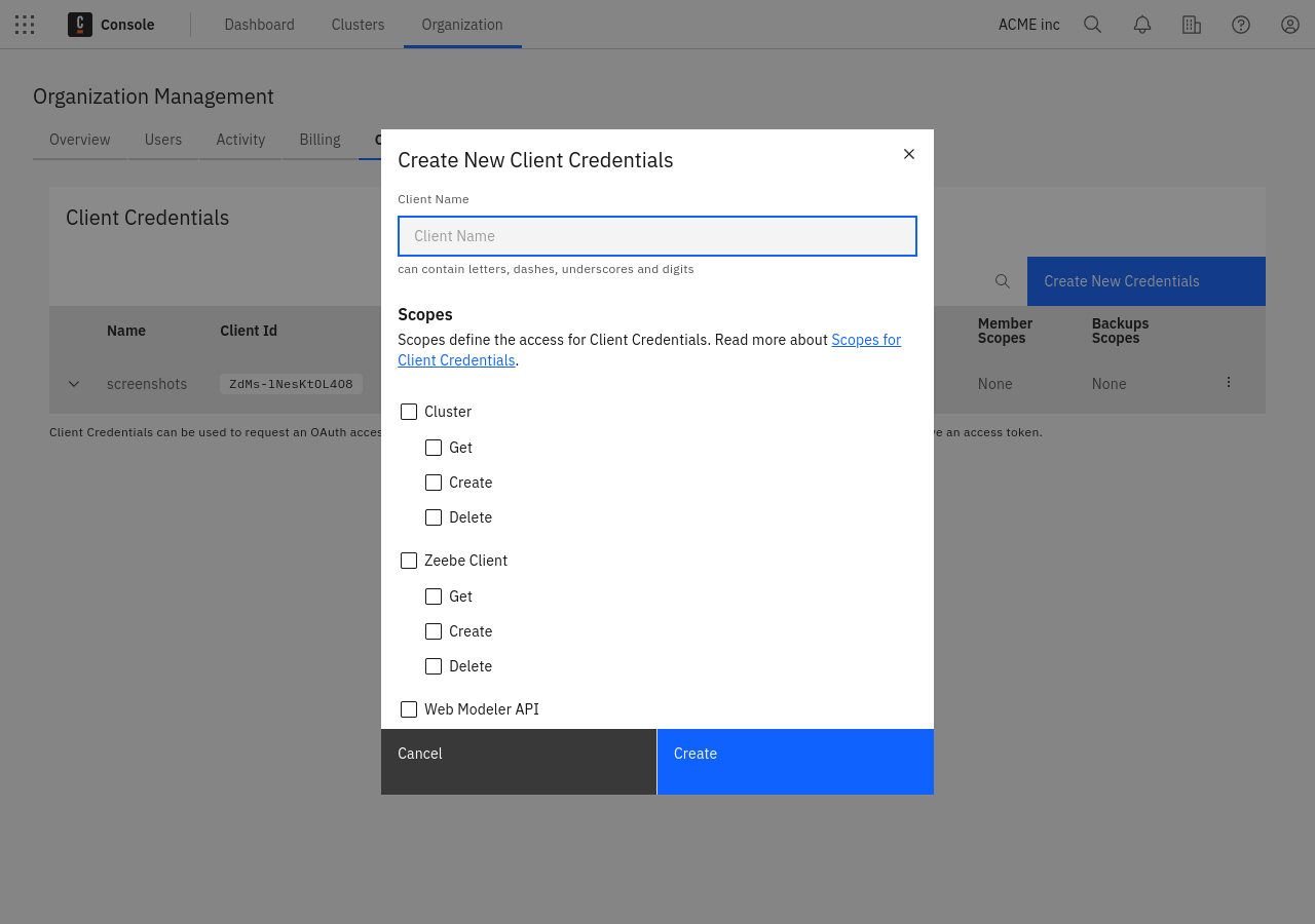 - Zeebe Client: Manage API clients for your cluster.