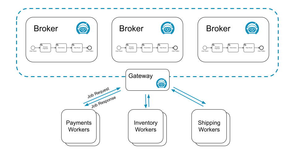 This increases the resilience of the overall system. Camunda 8 is highly available so job workers don't have to be highly available. Zeebe queues all jobs during any job worker outages, and progress resumes as soon as workers come back online.