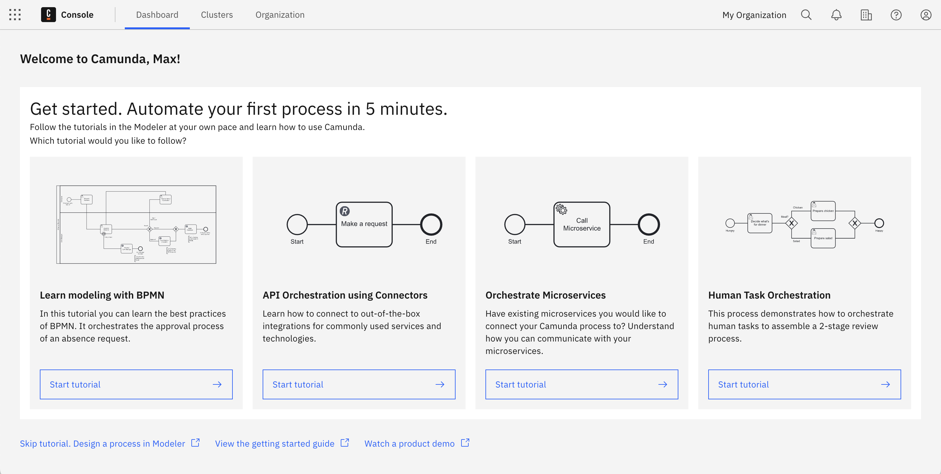 Create a Camunda 8 account so you can create clusters, deploy processes, and create a new instance.